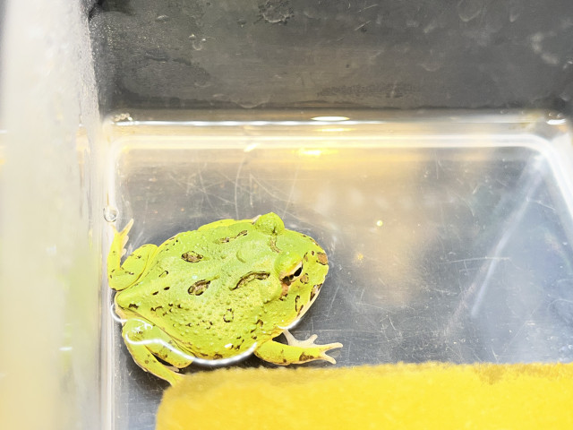 | コメント | ミントグリーンカラーのツノガエルです。体長5〜7cmのスモール個体。当店ではメダカを与えています。 |