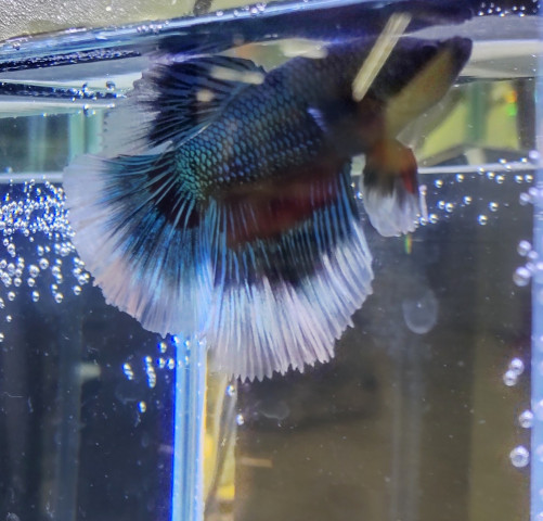 コメント 1点物セレクトベタです。メタリックなボディと大きく広がる透明に透けてる尾びれがとても綺麗なベタです。