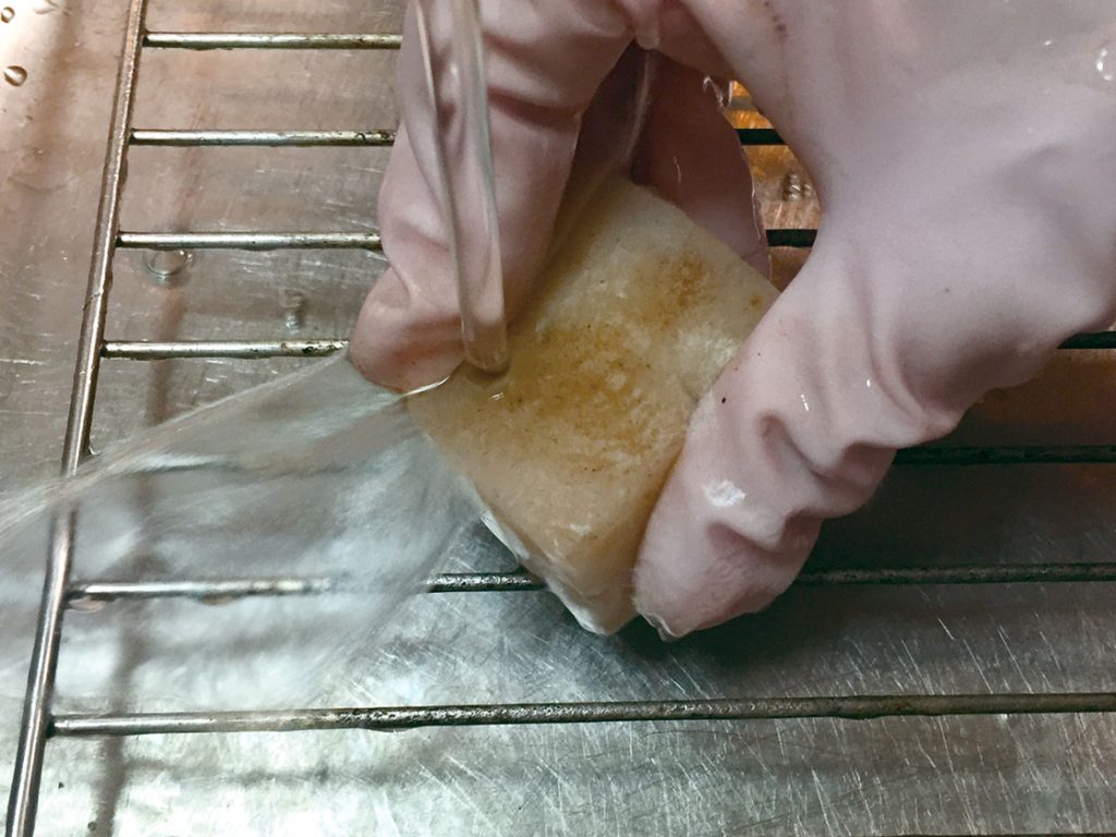 1)重曹湯でグツグツ煮た後こする+メラミンスポンジ。