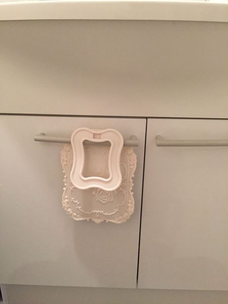洗面台の取っ手に、鏡のスタンドを引っ掛けました。