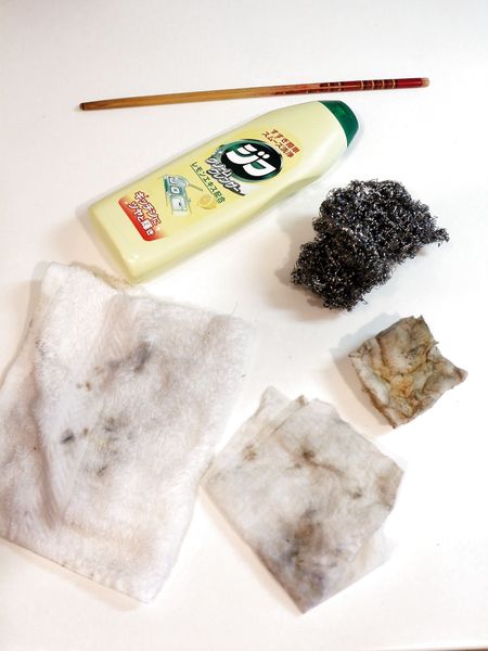 クレンザー、ステンレス束子、メラミンスポンジ、菜箸、キッチンペーパー、輪ゴム、濡れタオル(おしぼり)、布巾魚焼きグリル掃除スタート!掃除の手順とコツ紹介