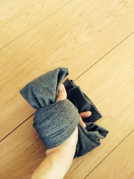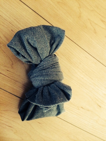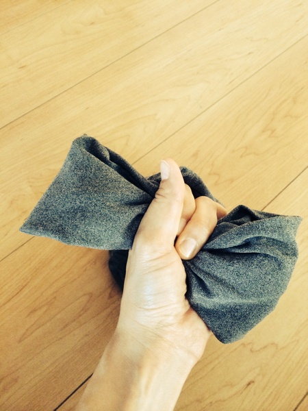 真ん中辺りを握り、残った部分を2周巻きつけて結びます。ストッキングは伸縮するので、引っ張りながらでも構いません。7)最後にギュッとして整えます
