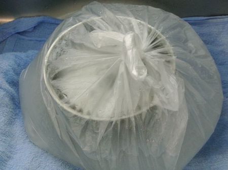 シンクのキズ防止のため、下にタオルを敷きます。セスキと重曹1:1をお湯に溶かしたものを、ビニール袋にファンと一緒に入れてしばらく置きます。こうすることで、油とほこりが落ちやすくなります。