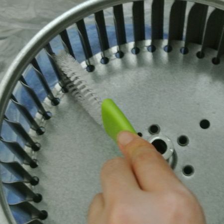 そして、ブラシで汚れをかき出すと、細かなところまで綺麗に掃除ができます。歯ブラシでもよいですが、専用ブラシがあると楽です。写真撮影のため手袋をはずしていますが、安全と汚れ防止のため、ゴム手袋または軍手の着用をオススメします。