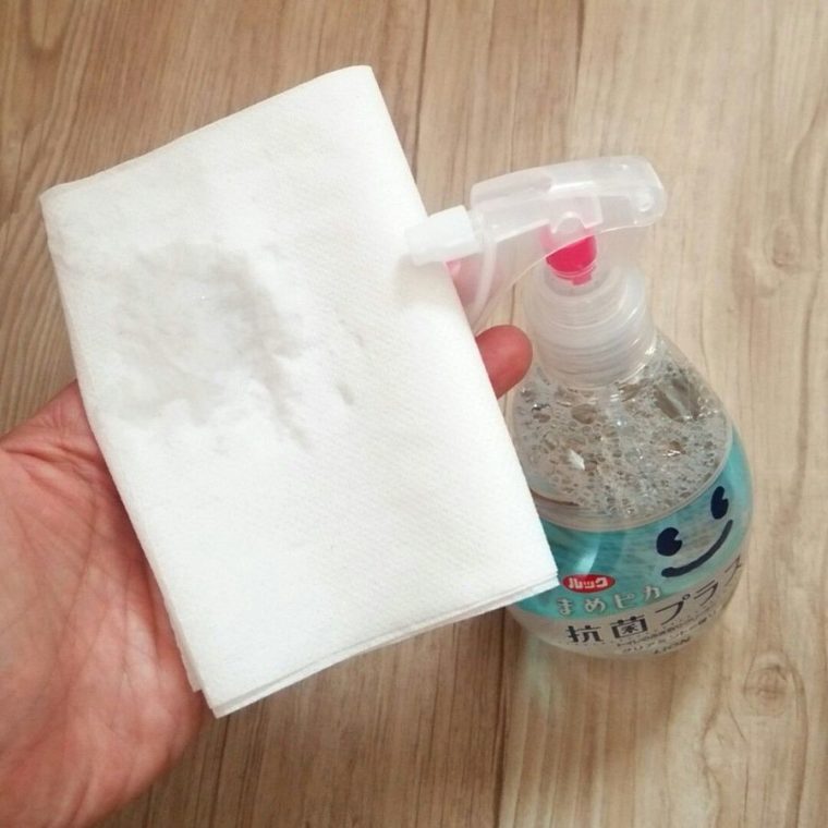 埃が多い場合は、掃除機で吸いとった方がよいそうですが、それは省きまして(笑)トイレットペーパーをたたんで、トイレ用クリーナーをスプレーします。