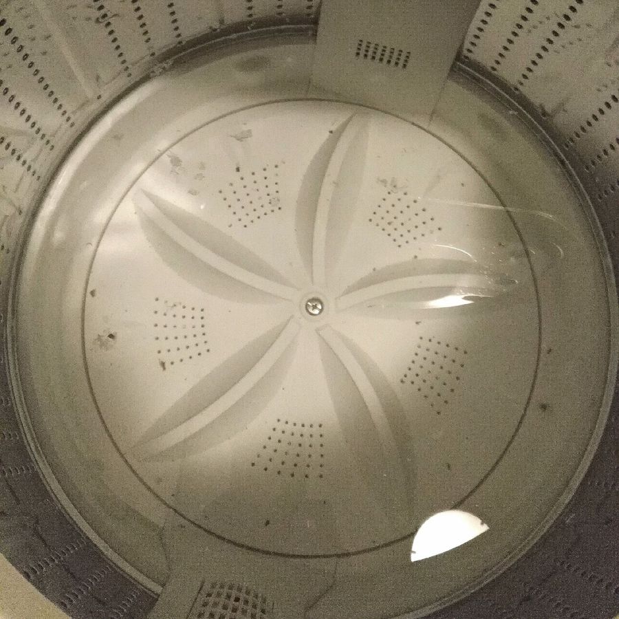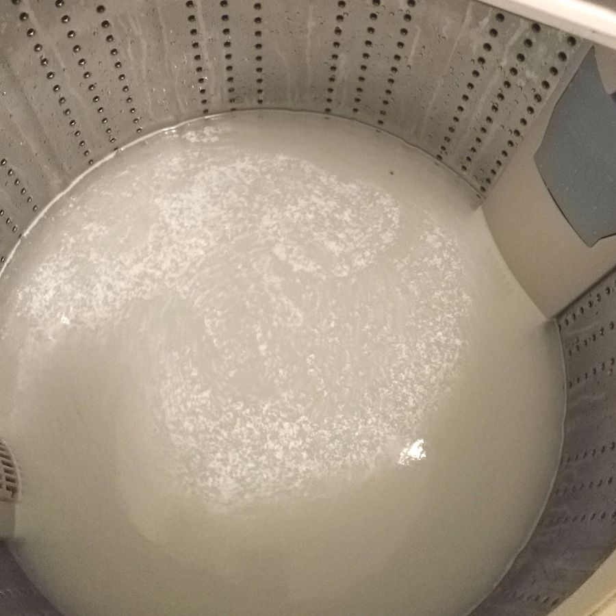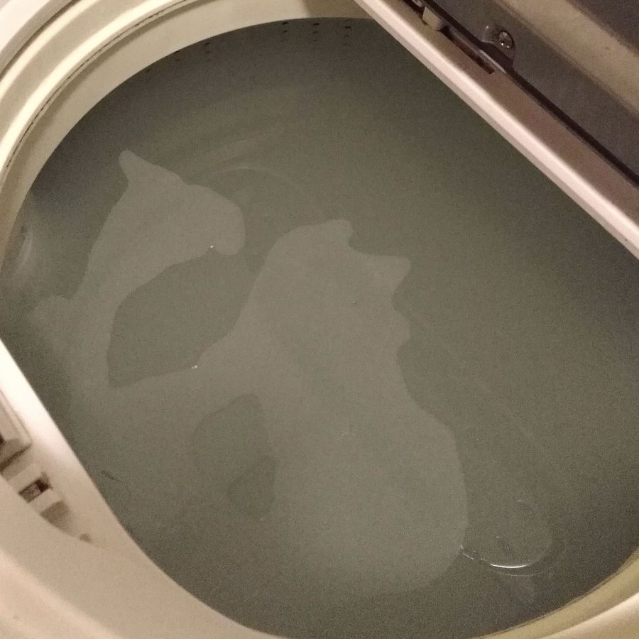 その後、お湯を足して少し運転、そのまま時間をおきます。すると…。ピロピロはないものの、明らかに水が濁っている!というか、むしろ黒い…!!この中で洗濯をしていたと思うと恐ろしいですね。わりと頻繁に掃除してたつもりなのに…。槽乾燥+お湯で効果が大きいのでしょうか。そのまま高水位で洗い→脱水まで通常運転します。