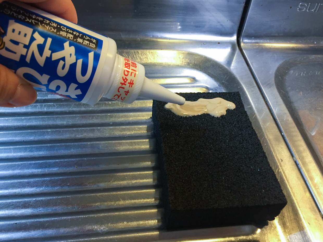 「さびとりつや之助」と「スポンジヤスリ」。20年以上前からお店にある神商品。残念ながら一般主婦にはなかなか知られておらず...私も3年目ぐらいにやっと、先輩店員さんからその存在を教わりました。知っていても、担当の売場ではない以上、なかなか自分で試すチャンスがない。せっかくだから試してみようかな。スポンジヤスリに、さびとりつや之助を付ける。