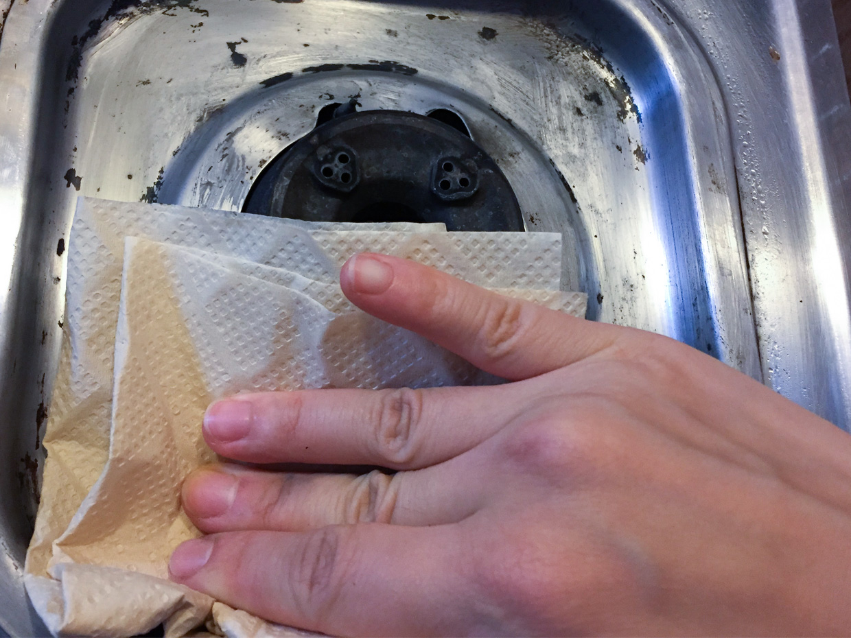 力を入れながらも、すぐに手が疲れてこない程度に3~4分間磨き続ける。仕上げにキッチンペーパーで空拭き。