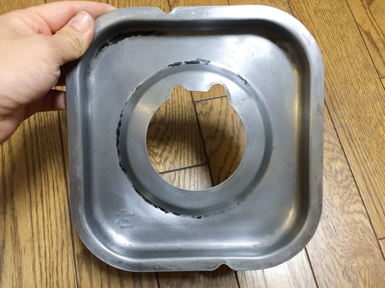 これはガスコンロの五徳の下にある受け皿。ついている焦げはすでに5年越え。(5年間、ちゃんと対策しなかった結果です。)これでも、オキシクリーン漬けして、焦げ落とし専用たわしでゴシゴシ磨いた後である。