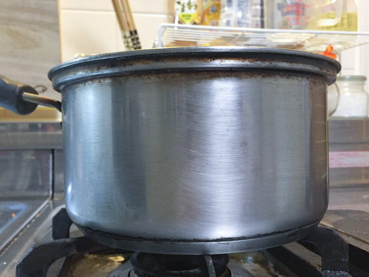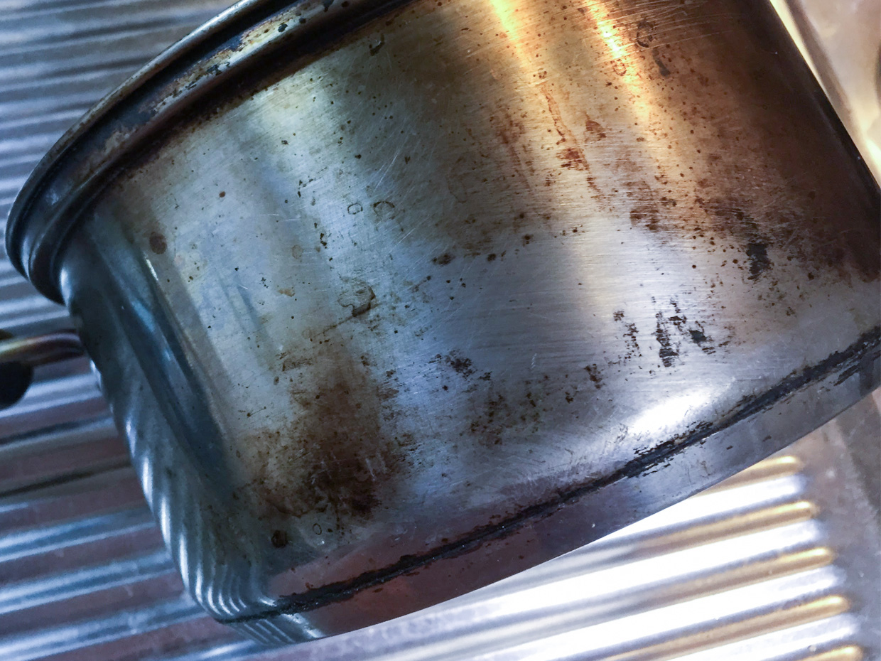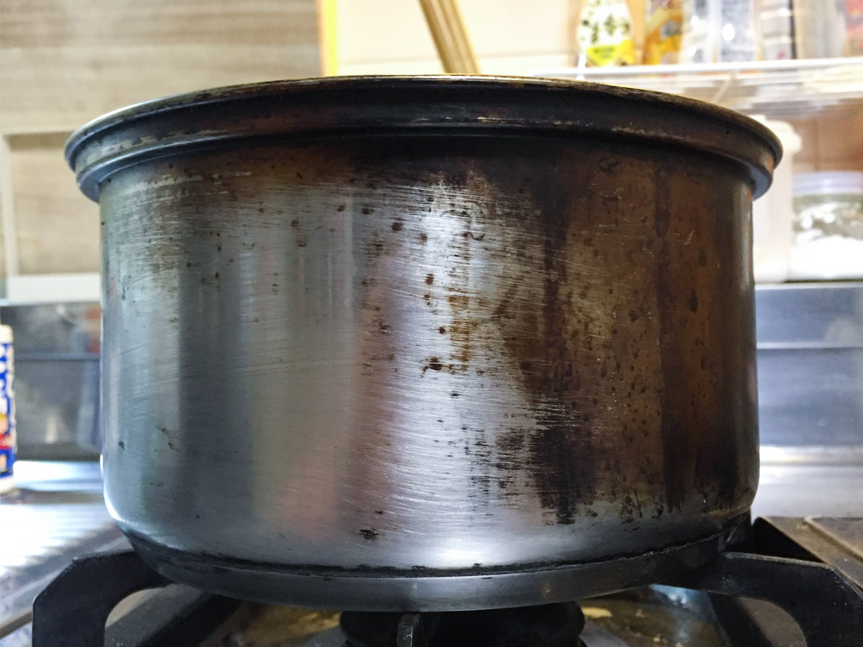 5年ものの焦げがだいぶ落ちた!ピカピカ効果も抜群。細かいところは微妙に残っているけど、それは主婦の怠けゆえ...今日のところはここまでにして、後日もう一回磨こう(やっぱり怠けものでした...)実は、さびとりつや之助の真の力は鍋が一番わかりやすい。例えばこのステンレス鍋の外側の焦げ。