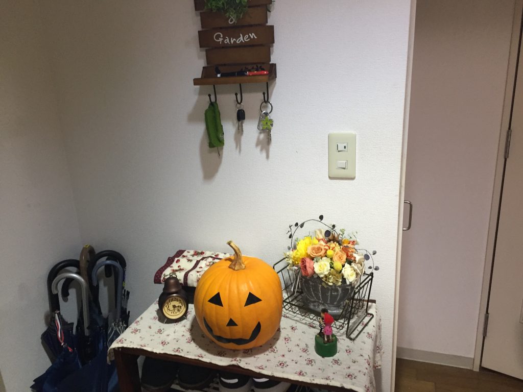 立派なカボチャ。でも、大きい・・・これ、買ったのはいいけど、飾り方はどうしよう。今までハロウィンを飾ることがあまりなく、リースをかけるぐらいでした。リビングで飾るのは難易度が高いので、玄関でこじんまりと済まそうと思ったのですが、やはりカボチャの存在感が半端ない・・・