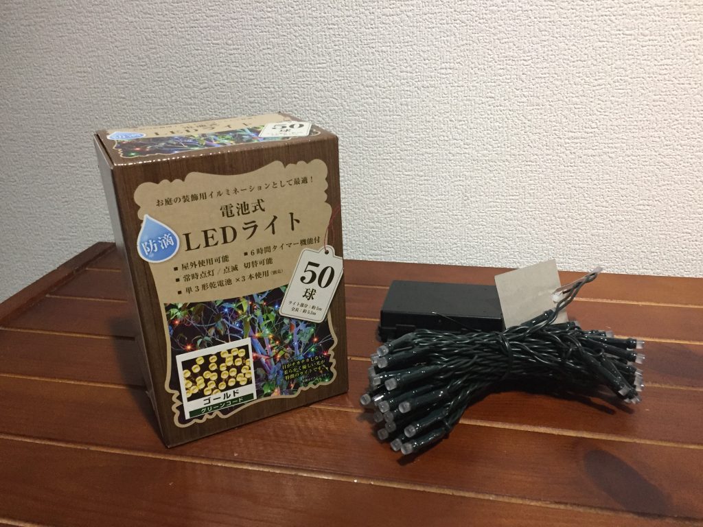 このために他の飾り物を買うとまたお金がかかる・・・何とか、ありもので済ませられないかな。 その「ありもの」を家中探してみたら、今までクリスマスで使っていたイルミネーションが出てきました。