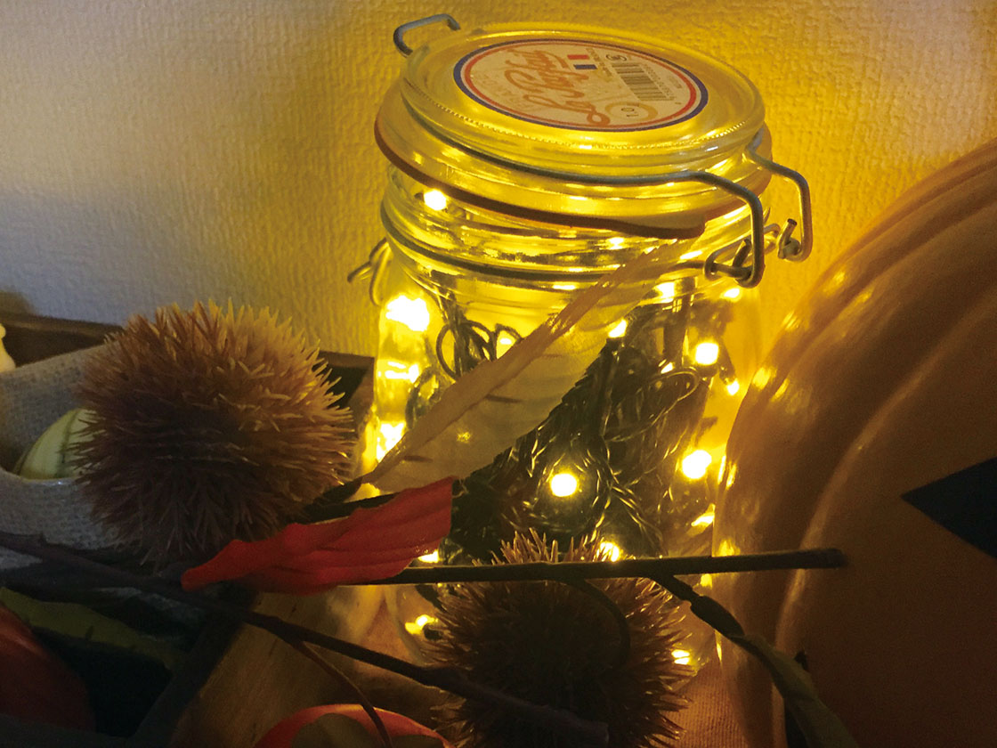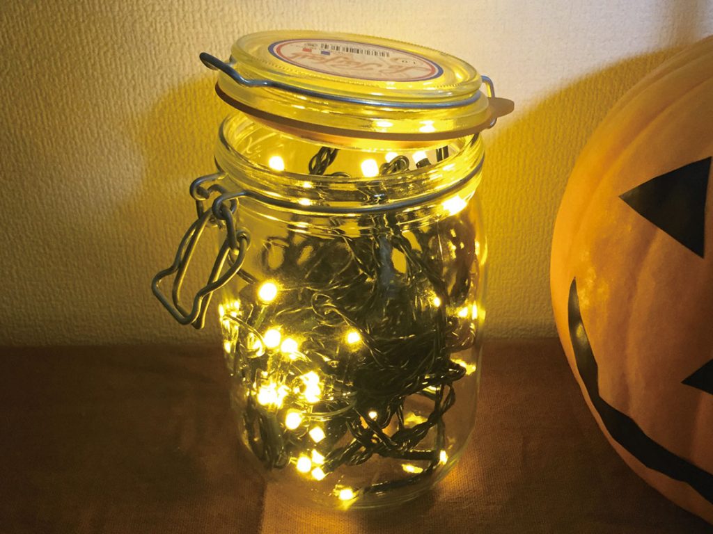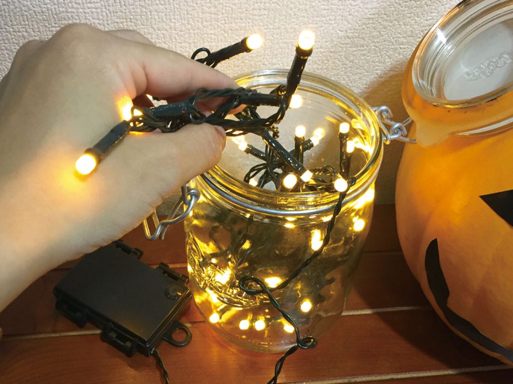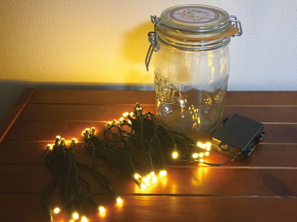 使い方は、イルミネーションを瓶に入れるだけ。電池式だから全部投入します!LEDだから、発熱も心配せずに済むのね。(コンセント式なら、瓶のフタを締めずに、コンセント部分だけ出しておけばOK!)