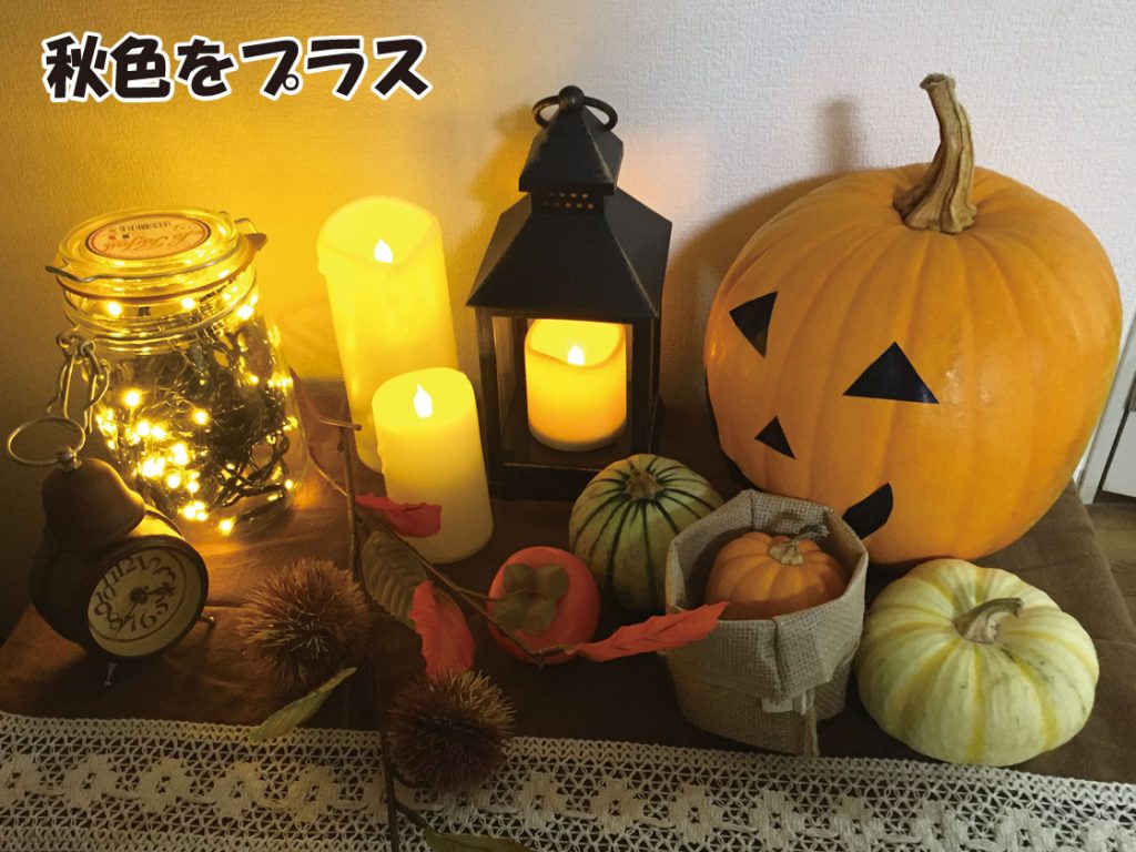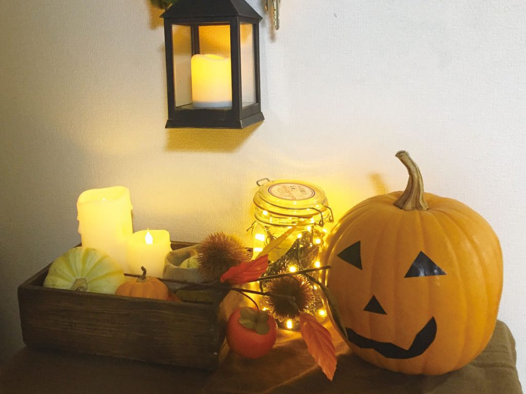 最終的に落ち着いたのはこれ。落ち着いた色の木の箱で、まとまりよく、ボリューム感も大きいカボチャとの相性も◎!