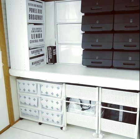 押入れは、ふすまを外して洋風の収納に。クッションフロアーと壁紙を、マスキングテープと両面テープで貼ります。部屋にあわせて、収納ケースなどの色も統一するとスッキリ。おしゃれ度が上がります!