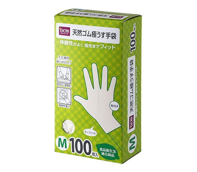 伸縮性が良く指先までフィットする、天然ゴム製の手袋です。手にぴったりフィットする超薄手仕上げで、素手感覚で作業できます!便利な左右兼用タイプ。100枚入り。サイズ:M(全長24cm、中指の長さ8.3cm、手のひらの幅9.4cm)※ご購入はDCMの店舗へお問い合わせください