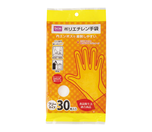 内エンボスで着脱しやすい、手軽に使える万能タイプのポリエチレン手袋です。酸・アルカリに強く耐薬品性に優れています。左右兼用の使い切りタイプ。30枚入り。サイズ:フリーサイズ※ご購入はDCMの店舗へお問い合わせください