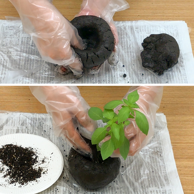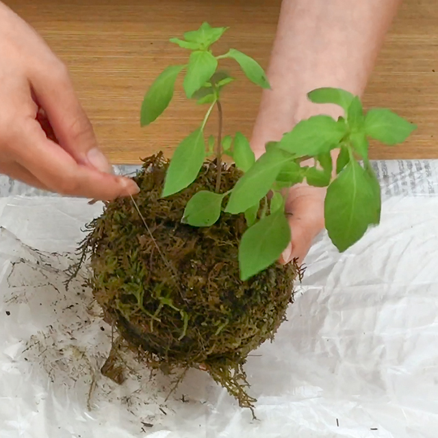 ボール状に形成した土にくぼみを作りお椀型にします。くぼませた部分に、植物と培養土を入れます。