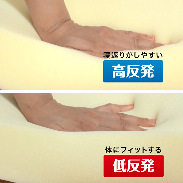 お好みの寝心地に合わせてお選びいただけます。●高反発タイプ…身体が沈み込みにくく寝返りがしやすい●低反発タイプ…身体が包み込まれて寝心地が良い
