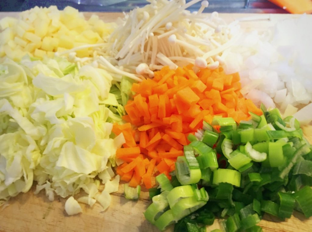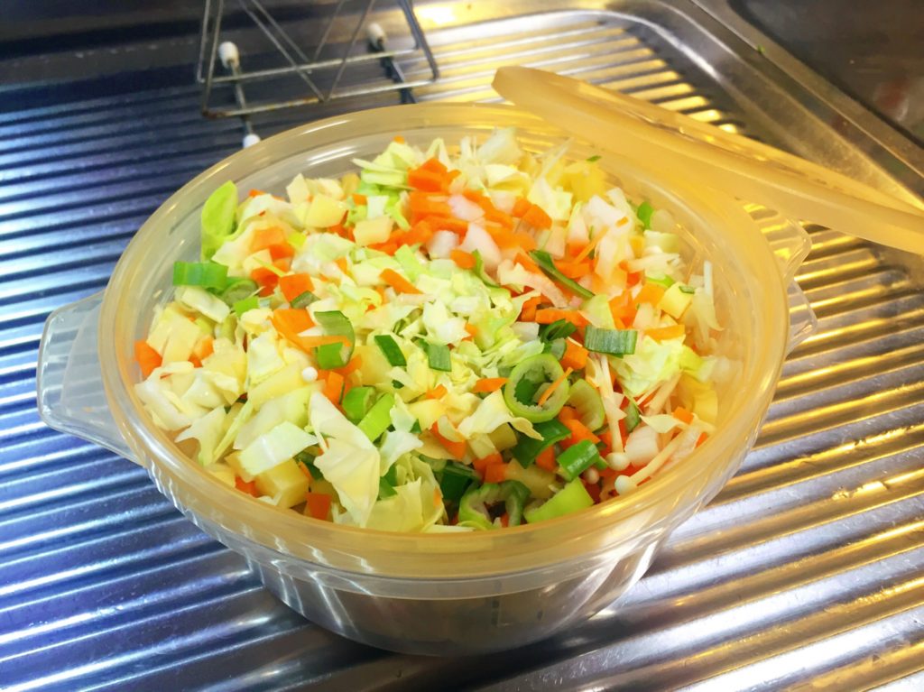 仕事→娘のお迎え→お買い物で帰宅はPM18:30。そこから夕食準備して娘に食べさせて…よく頑張ってくれたねと褒めて欲しいくらいです (๑`^´๑)とは言え、多少、反省しております。職場の先輩ママNさんに相談したら、「野菜玉作っちゃえば?」との一言。「野菜玉」…最近よく聞くかも。作り方も簡単そう。纏まった時間が多少とれる日曜日の午後に、いざ作業開始! 人参、玉ねぎ、きゃべつ、じゃが芋、娘が大嫌いなきのこ…。娘の邪魔が入るも作業は30分で完了。
