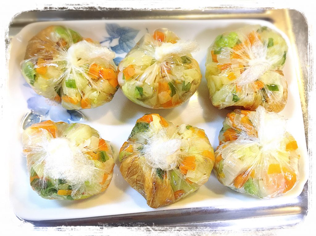 「チン」と加熱が済んだら、今度は一食分ずつラップで巾着状に包みます。もう一種類、お味噌と顆粒ダシも入れて包み、「野菜味噌玉」も準備完了。見た目綺麗だし、凄い達成感!