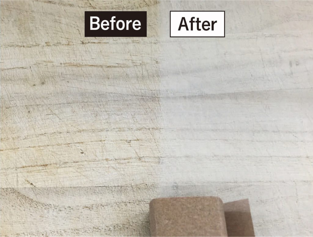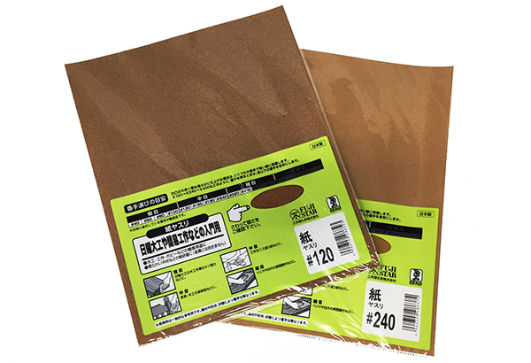 おお、なんだか、表面の傷とともに、黒ずみが消えてきたかも!さらに、細かい240番目の紙ヤスリに取り換えて、表面の仕上げに励むと――