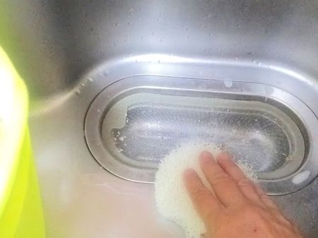 汚れを見つけたら、洗剤液の中でスポンジでこすって落とします。再び指で確認して、キュッキュッとした感触になったら汚れが落ちたサインです。
