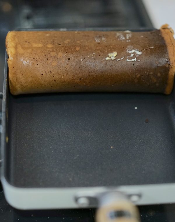 5)フライ返しなどで、生地を巻いていく。残り半分の生地も同じように焼く。