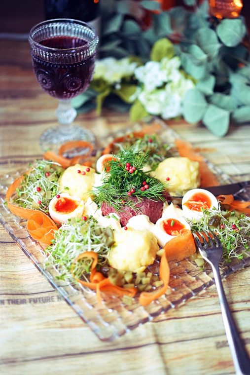 5)大きめのお皿の真ん中にコンビーフを置いて、半分に切ったゆで卵や、マッシュポテト、スプラウト、にんじんなどを彩りよく盛りつけたら、ピクルスを散らし、コンビーフの上にディルとピンクペッパーを飾る。間にマヨネーズをホイップみたいにデコレーションすれば完成。食べる時にナイフとフォークを使ってつぶしながら混ぜます。