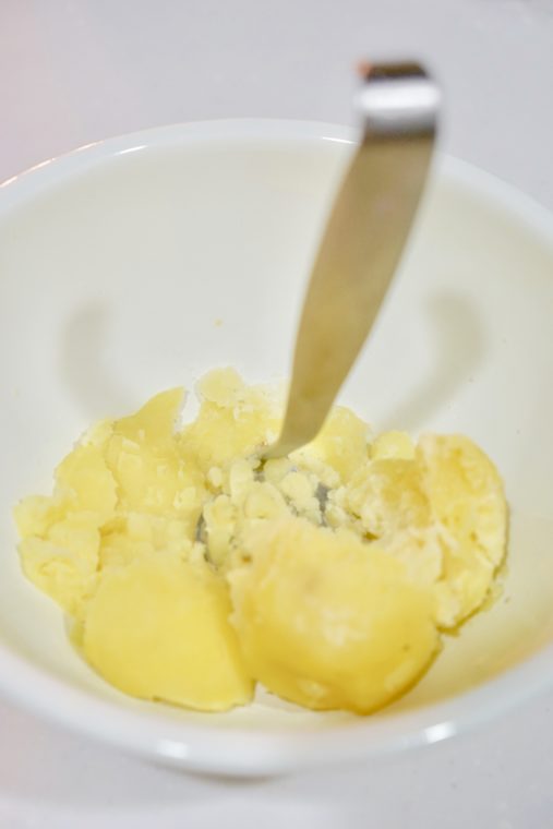 4)コンビーフは500wのレンジで約10秒温めて、2個分をまとめて丸く形をととのえておく。1)のマッシュポテトも3等分くらいにして、丸く形をととのえる。
