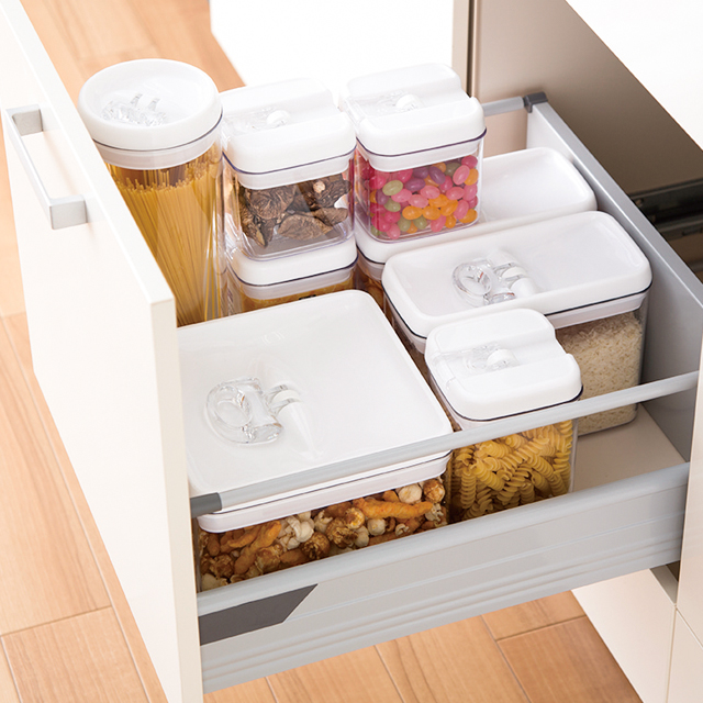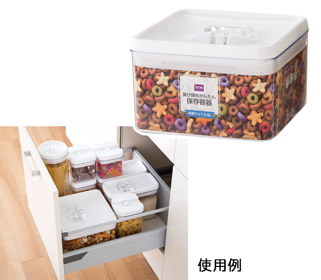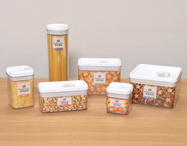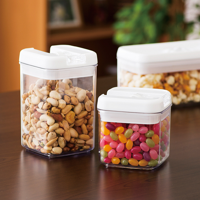 レバーを動かすだけで、開け閉めが簡単にできる保存容器です。パスタやお菓子などサイズに合わせて選べ、重ね置きができるので冷蔵庫の中などの空間を有効的に活用できます。