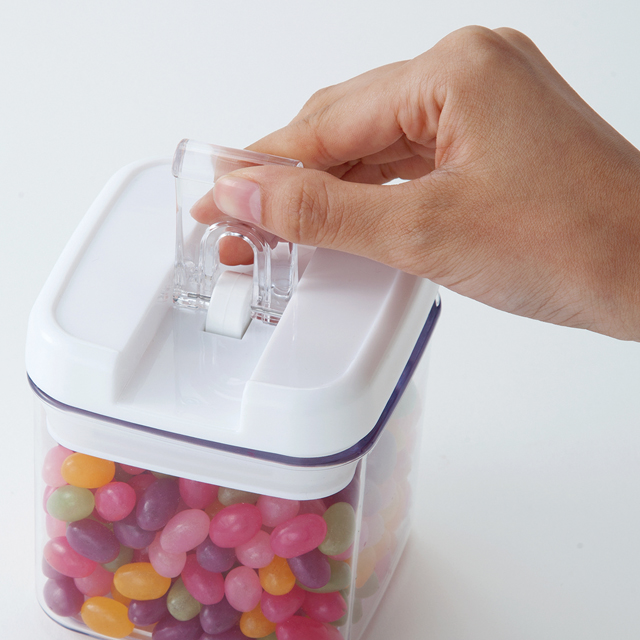 密閉性が高く、湿気をしっかりシャットアウト!重ね置きができて収納に便利な保存容器です。蓋上部の透明なレバーを上げ下げするだけなので、蓋の開閉がとっても簡単!お菓子やナッツなどの保存に便利なサイズです。