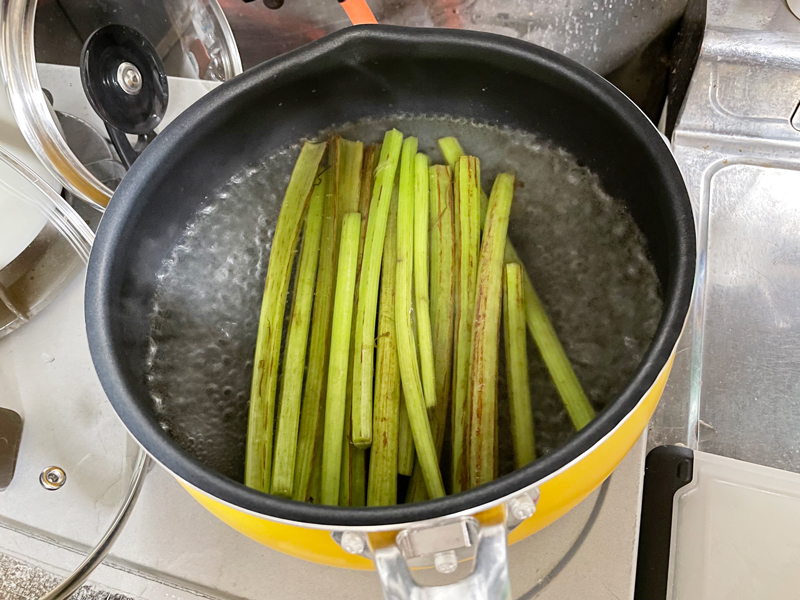 米を研いでざるにあげ、30分ほど置いておく。ふきを板ずりし、たっぷりのお湯で塩が付いたままのふきを3~5分茹でるバットに水をはっておき、茹でたふきをつけて冷ます。