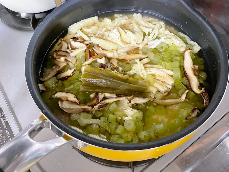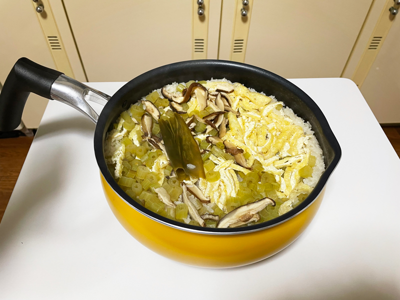 ふきの皮をむき、約1cmに切る。油揚げはお湯でさっと茹で、粗熱を取り、水気を絞って細切りにする。マルチパンに米、具材、塩少々、しいたけの戻し汁+水約450mlを注いで炊く。