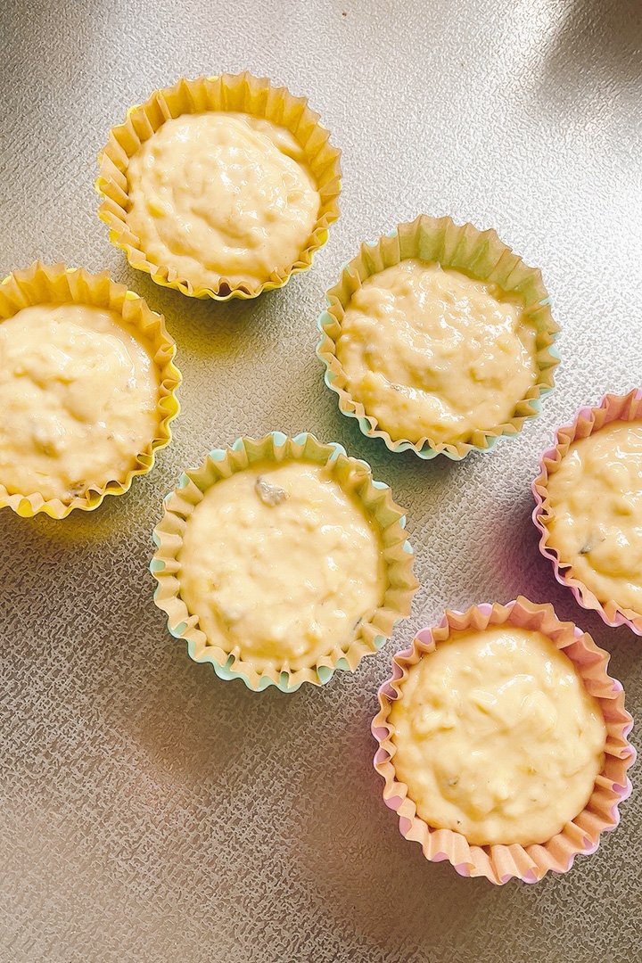 <材料>(9号カップ6つ分)ホットケーキミックス 150gバナナ 1本卵 1個砂糖 大さじ2牛乳(豆乳も可)大さじ4サラダ油 大さじ2