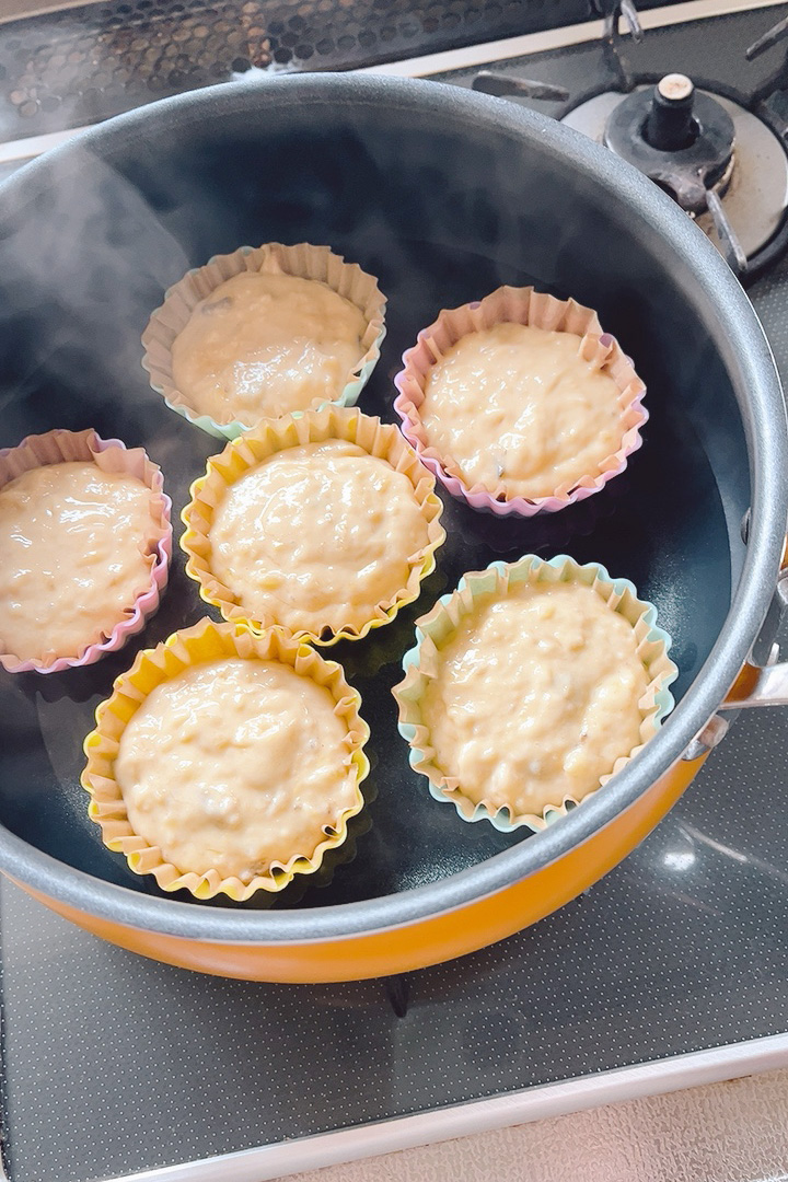 マルチパンに水を入れて沸騰させる。(水はマルチパンの底から1cmくらいの高さまで)沸騰したら一度火を止め、カップを並べ、再び火を点けて沸騰させる。