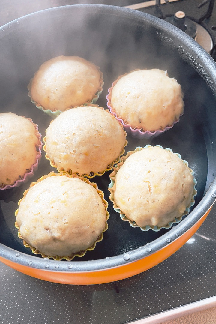 蓋をして中火で約13分ほど蒸す。途中で水が少なくなってきたら足す。竹串をさして、生の生地が付いてこなければ完成。