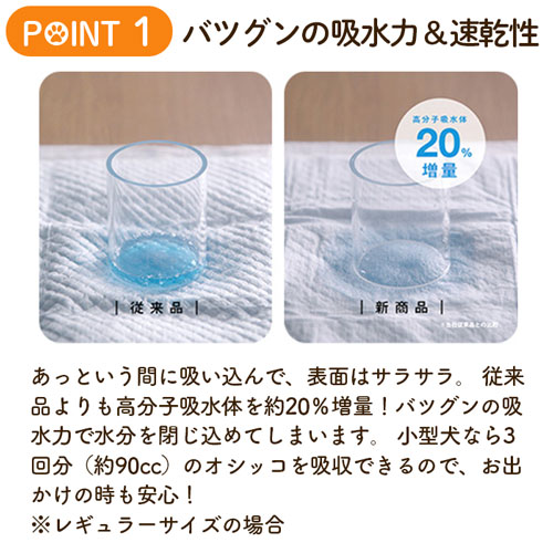 せっけんの香りは、希釈したアンモニアをかけて尿と混じったニオイを再現し、一番気にならないものとしてモニター会の投票によってを選ばれました。レギュラー(120枚)小型犬のおしっこ3回分(約90㏄)を吸収。ワイド(60枚)小型犬のおしっこ3~5回分(約90~150㏄)を吸収。スーパーワイド(30枚)小型犬のおしっこ5~8回分(約150~240㏄)を吸収します。
