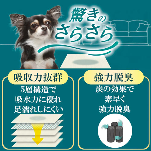 5層構造で吸水力に優れ足ぬれしにくい吸収力抜群のペットシーツ。レギュラーサイズ1枚で小型犬の2~3回分のおしっこを吸収、ワイドサイズ1枚で小型犬の4~5回分、中型犬の2~3回分のおしっこを吸収します。吸収スピードも速いので濡れ戻りが少なく足ぬれしにくい。炭の効果で素早く強力脱臭してくれるのもうれしいポイントです♪