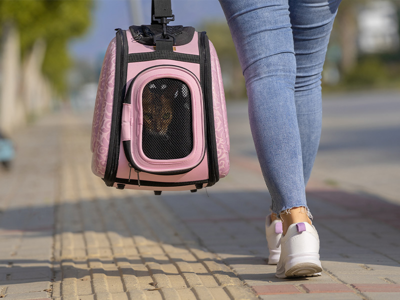 普段からキャリーの入口を開放して出入りできる環境で慣れさせるのがおすすめ。いざというとき「キャリー=安全で安心な場所。自分のにおいがする場所。」といった認識を持ってくれれば、キャリーに入れて速やかに避難へ向かえますし、避難所にて、長時間キャリーで生活をすることになっても、慣れていれば少しは安心。キャリーは頑丈なハードタイプがおすすめですが、緊急時に飼い主が素早く身動きがとれるかどうかも重要なポイント。必要に応じて、肩掛けタイプや折り畳みタイプの軽量なものにするなど、見直しが必要です。準備した防災用品を実際に手に持ち、無理なく運べるかどうか試しておきましょう。移動の際も、ハーネスを付けておくと脱走防止になります。