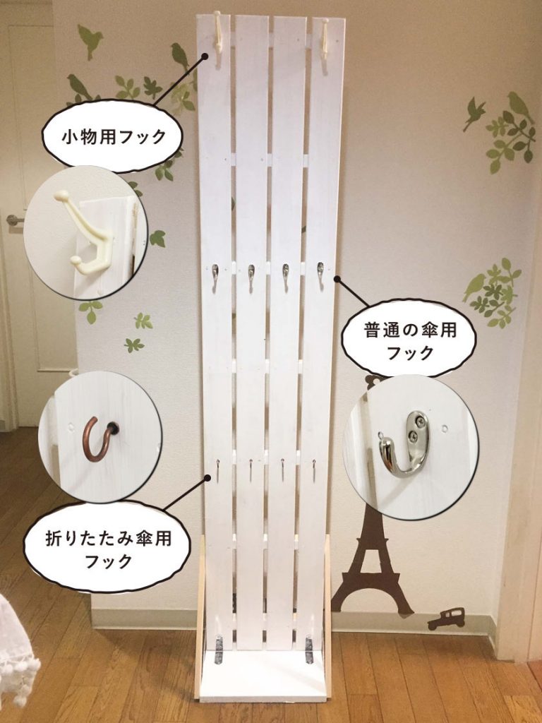 実際に玄関に置いてみて、傘や小物をかけてみました。
