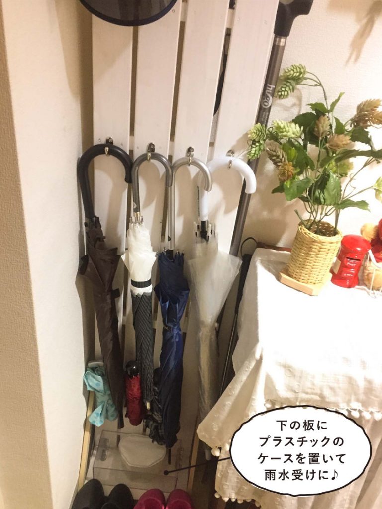 下の雨水受けようプラスチックケースに除湿剤を入れたりして湿気対策に。傘の数も、掛ける場所決まっていて、わかりやすくて取り出しやすい。意外と、理想に近い傘立て、いや傘掛けができたかも?!(≧▽≦)以上、くらしメモでした。