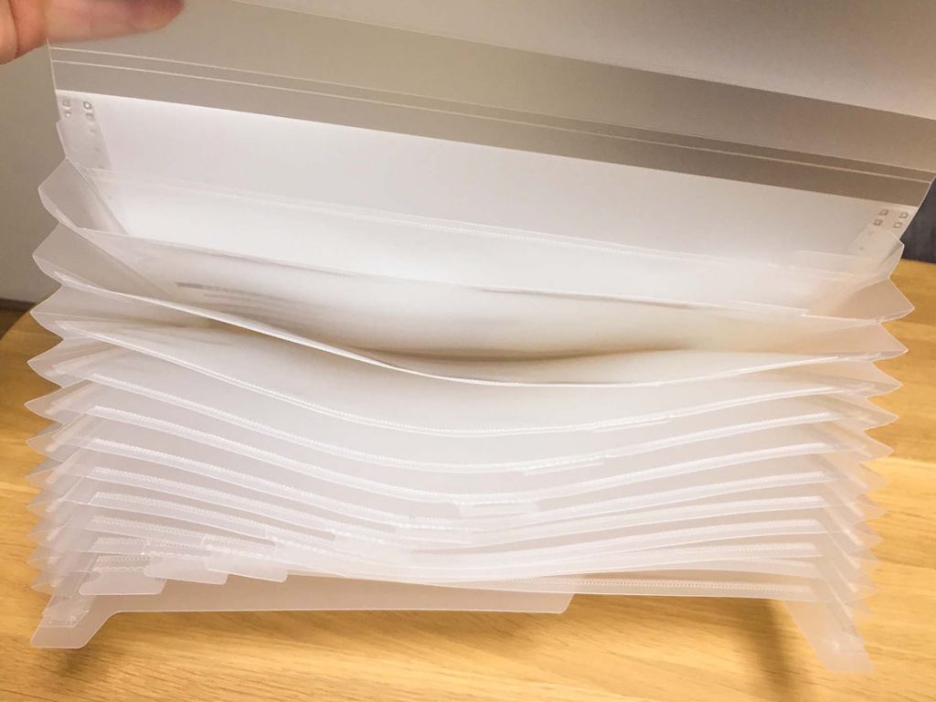 サイズ感も一枚一枚の厚さも、レシート収納にピッタリの設計。でも、細かく仕切っているから、きっちり入れるのはかえって面倒だわ。しかも一年分。本当に入るのかしら。(そう思うのは私だけかもしれない...) もうちょっとおおざっぱでわかりやすいモノは...あった!