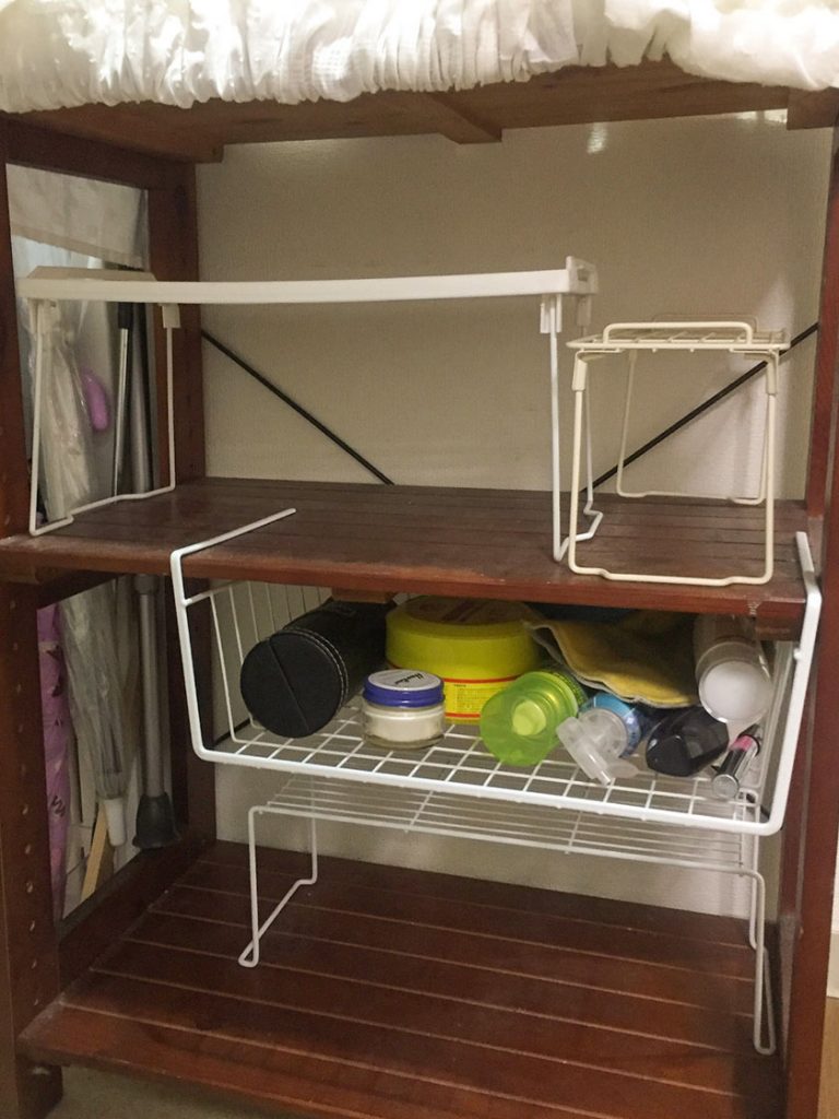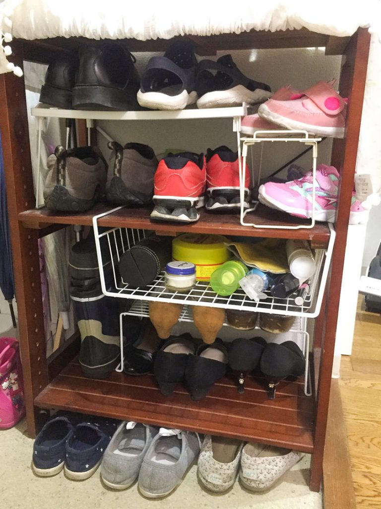 前も違う記事で靴棚の写真を出したりしていましたが、カフェカーテンで中身を隠していました。実はよく見ると、中の段の高さが無駄に高かったり、横幅が合わなかったりして、いろんな収納グッズと合わせて使ってもやっぱり使いにくい。