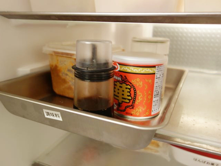 フレンチドア(観音開き)冷蔵庫の場合、大きく分けて、左側を主に料理をする人が使う「調理」、右側を家族が使う「すぐ食べ」スペースにします。写真は左側の調味料です。調理バットでグルーピングすることで、食べ物の点在を予防。ラベリングすることで、家族の協力&戻す意識も高まります。これにより、誰が使うかによって開閉が片側だけで済むため、時間・手間が省かれ、節電が可能に。