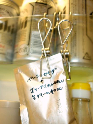 クリップをフックなどでドアポケットに引っ掛け、あえて目立つ場所に使いかけの袋物、容器に移し替えるまでもない鰹節の開封済みのパッケージなどをはさんで収納します。これにより、うっかり忘れを防止できます。