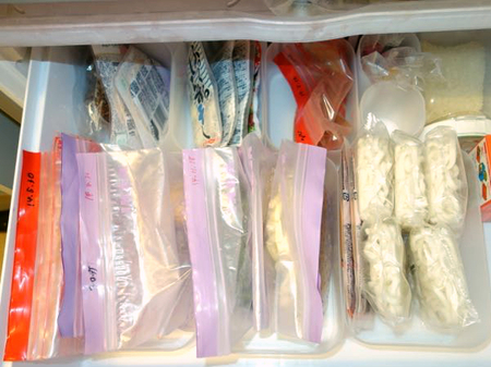 こちらも四角い収納ボックスでグルーピングします。保存袋には賞味期限を記入し、右側→左側の順番で、古い食材→新しい食材で在庫管理します。時間の経過を忘れがちな冷凍食材こそ、時系列で管理するのがオススメです。