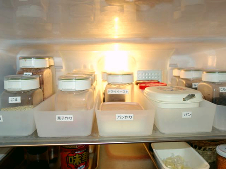 使いづらい冷蔵庫上段は、奥行きめいいっぱい使ってカテゴリー別にグルーピングしています。整理トレーや浅めの収納ボックスで縦収納です。ここでは、よく使うご飯のトモ、パンのトモなどを入れて、積極的に死角も有効活用します。