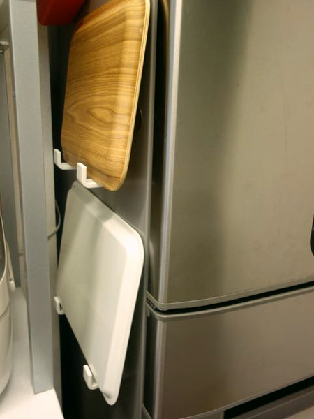 冷蔵庫横にフックを2つずつ装着し、大小それぞれのトレーを置きます。必要な時にサッと取り出せ、隙間も有効活用できます。