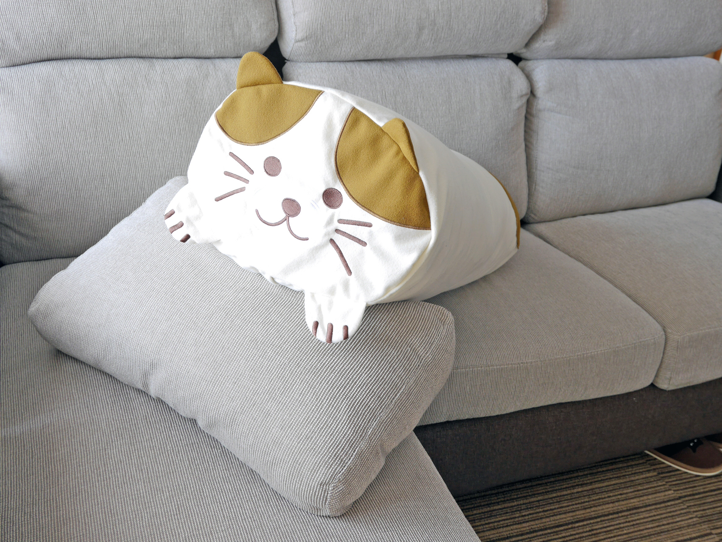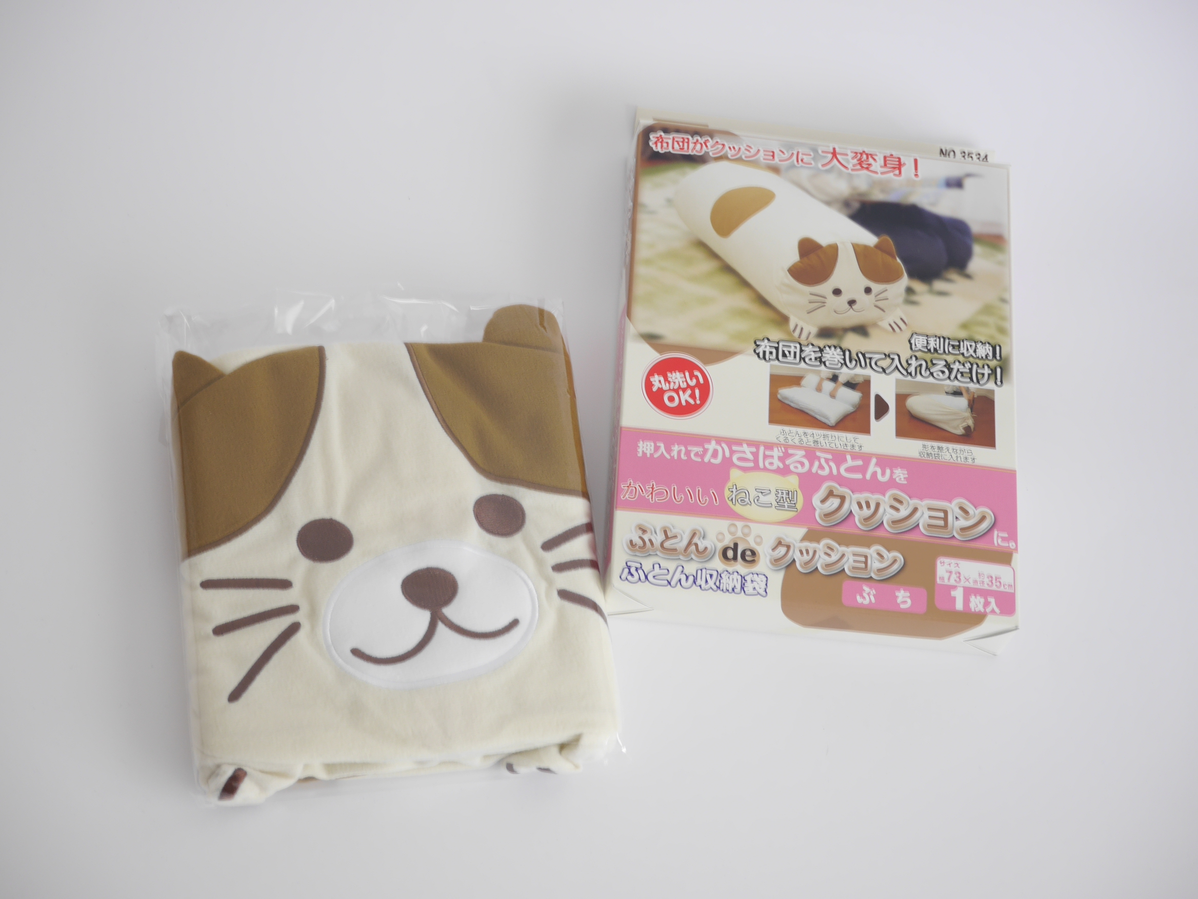 説明しよう。猫のぶちクン、本名「ふとんdeクッション(ぶち)OR-3534」by(株)オリエント。使わない布団をおなかにいれて、クッションに変身する優秀な猫様!